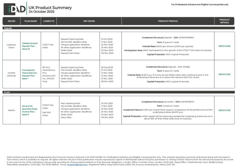 Neither this website nor any documents contained within it constitutes investment advice or an offer or solicitation to sell in any jurisdiction in which an offer, solicitation, purchase or sale would be unlawful under the securities law of that jurisdiction.   The material contained within is purely for information purposes and its accuracy cannot be guaranteed.  Investments may go up or down in value and you may lose some or all of the amount invested. Past performance is not necessarily a guide for the future. Returns from the structured products are at risk in the event of any of the institutions who provide securities for these products default on their financial obligations. Any decision to invest should be based on the information contained in the relevant term sheet or prospectus (and any supplements thereto) of the relevant product which includes information on certain risks associated with an investment.