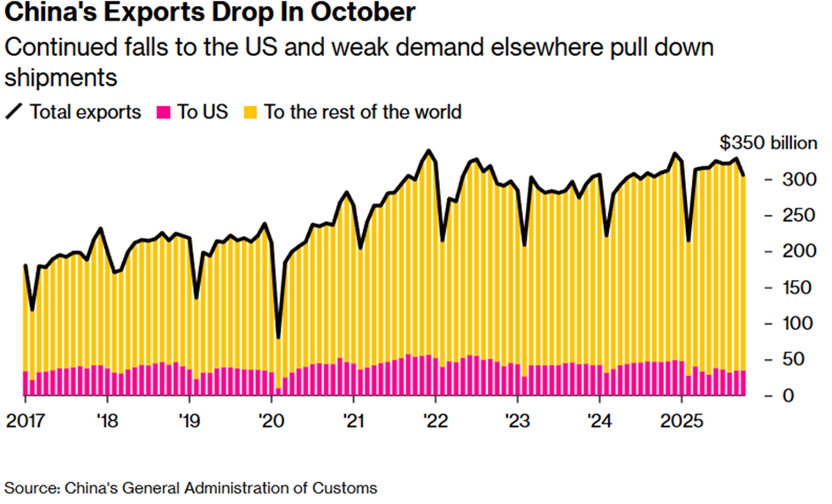 China’s latest trade data delivered a reality check. Exports fell 1.1% year-over-year in October, marking the first decline in eight months, as shipments to the US decreased by more than 25%. The drop surprised almost every forecaster and underscored the fading of the post-COVID export boom. Shipments to other markets, notably Asia and parts of Europe, rose modestly but not nearly enough to offset the weakness in the US.