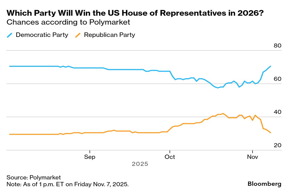 Markets barely flinched, but political betting markets did. On Polymarket, Democrats’ chances of taking the House of Representatives in 2026 rose to 71%, up more than ten points in a week. The Senate remains a tougher contest, with the probability of a Democratic win rising modestly to around 35%, reflecting the challenging electoral map.