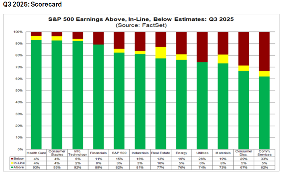 For all the talk of fatigue, corporate America is finishing the third-quarter earnings season on a solid note. With more than 90% of S&P 500 companies now reported, results have been consistently better than expected. Around 82% of companies beat earnings forecasts, the highest proportion since 2021, and revenue surprises have been broad-based across sectors from tech and industrials to financials and healthcare. The blended earnings growth rate now sits above 13%, marking the fourth straight quarter of double-digit expansion.