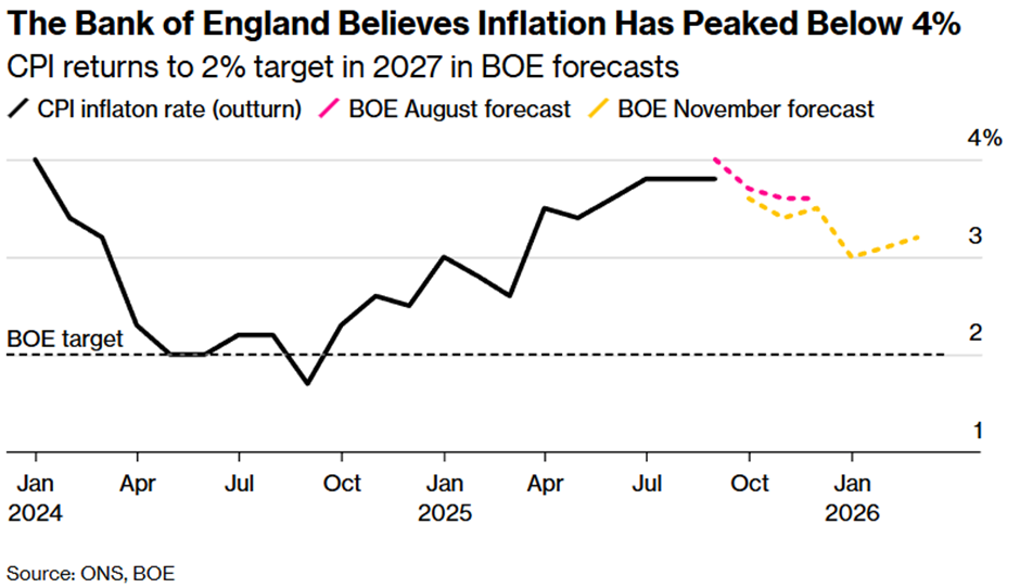 The Bank described September’s 3.8% inflation rate as ‘likely to be the peak’ and quietly removed the word careful from its forward guidance on future cuts. Bailey said the risks to inflation had ‘moved down to become more balanced.’ At the same time, the Monetary Policy Report noted that the risk of inflation persistence has become less pronounced and that the risk to medium-term inflation from weaker demand is now more apparent.
