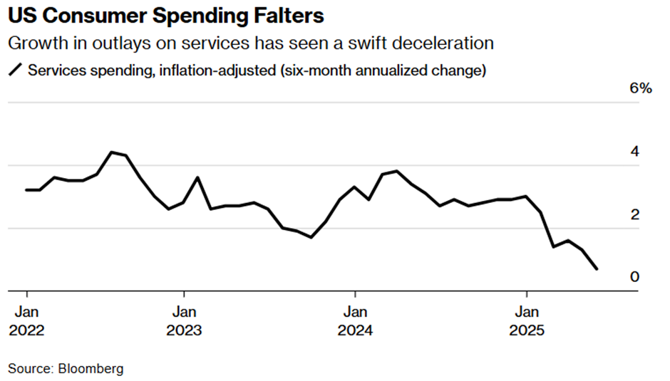 Still, under the surface, the economic picture remains mixed. The latest personal spending figures painted a more fragile backdrop. Real consumer outlays fell 0.3% in May, marking the sharpest decline since the start of the year and a broad-based drop across both goods and services. That included weaker demand for transport, dining, travel and financial services, all categories sensitive to sentiment. The data confirm that household demand has softened meaningfully since the start of the year, weighed down by tariff uncertainty, falling transfers, and a gradual erosion in confidence. While wages rose again, helping offset some of the drag, personal income fell for the month, and the saving rate dipped to just 4.5%. Core PCE inflation nudged slightly higher but remains well contained. In short, the consumer still has spending power but is showing signs of restraint just as policymakers start to assess how deeply tariffs may cut into demand in the coming quarter.