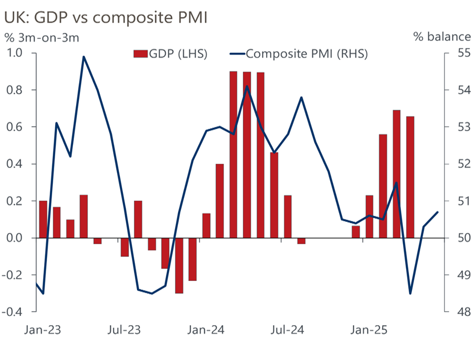 The June flash PMI offered little encouragement. The composite index ticked up to 50.7 from 50.3, leaving the Q2 average just below the ‘no change’ threshold consistent with flat GDP. Firms continued to cut jobs, and both input costs and selling prices eased again, reinforcing the case for further policy loosening.