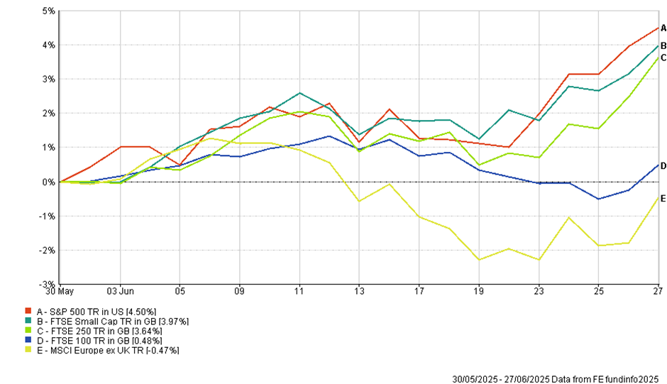 As we near the end of the second quarter, US Equities surged to fresh all-time highs, defying the usual post-conflict caution and brushing aside another week of tariff noise. The S&P 500 powered past its February peak to close above 6170, capping a rally that has now added over 10 trillion dollars in market value since the April low. Nvidia flirted with the $4 trillion mark! The dollar weakened, slipping to its lowest level in nearly three years. Treasury yields fell, with the 10-year Treasury dropping toward early May lows. Oil prices retreated sharply, while investor sentiment remained buoyant. A rarity in 2025, large-cap UK and European markets haven’t kept pace with the US this month, but currency-adjusted returns were much more level-pegging, and UK mid and Small-caps continue to recover strongly.